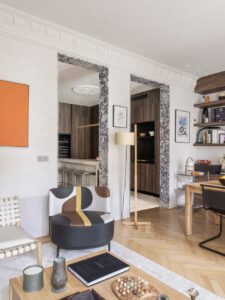 Este piso, en un edificio de 1905, ha conservado muchas de sus señas: ladrillo visto, chimenea, molduras… pero reinterpretadas en clave contemporánea.